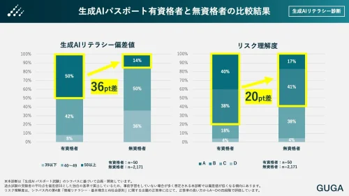 生成AIパスポートの有資格者は、生成AIリテラシー偏差値50以上の割合が50%、リスク理解度「A・B」評価が78%であったのに対し、無資格者は生成AIリテラシー偏差値50以上の割合が14%、リスク理解度「A・B」評価が58%にとどまっており、学習経験の有無による差が浮き彫りになった。