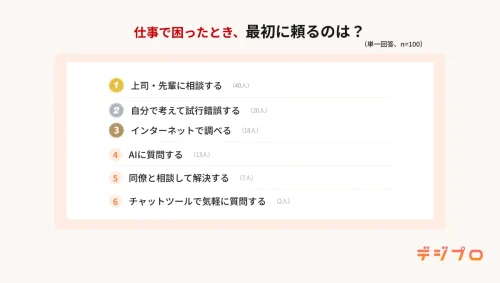 「仕事で困ったとき、最初に頼るのは?」の回答で、最多は「上司・先輩に相談する」(40人)だが、「自分で考えて試行錯誤する」(20人)、「インターネットで調べる」(18人)と、個人での解決を志向する人も。「AIに質問する(13人)」も4位。