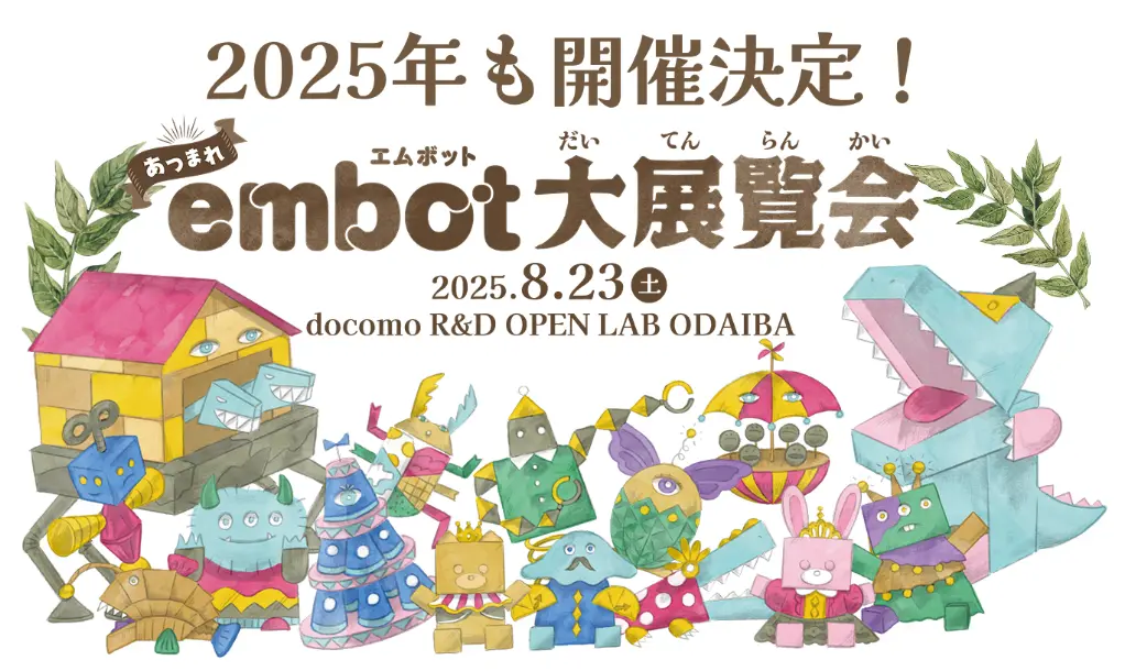 プログラミング教育サービス「embot」を展開するe-Craftは、embotを活用した作品展示会「embot大展覧会2025」を、8月23日にdocomo R&D OPEN LAB ODAIBAで開催する。