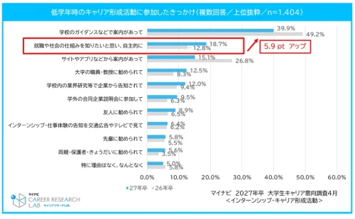 それによると、大学1・2年生時のキャリア形成活動については、48.4%の学生が参加しており、年々増加傾向にある。参加のきっかけは、「就職や社会の仕組みを知りたいと思い、自主的に」が18.7%で前年(12.8%)より5.9pt増加。低学年時から自主的にキャリア形成活動に参加する傾向が強まっていることを示しており、自身の将来に対しての考えや意識を主体的に考えていることがわかる。