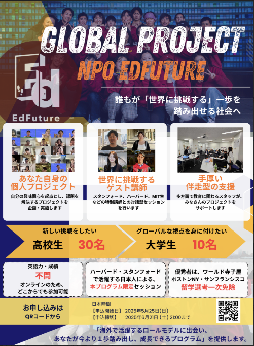 EdFutureは21日、高校生・高校生けの探究型プログラム「グローバルプロジェクト2025」の受け付けを開始した。