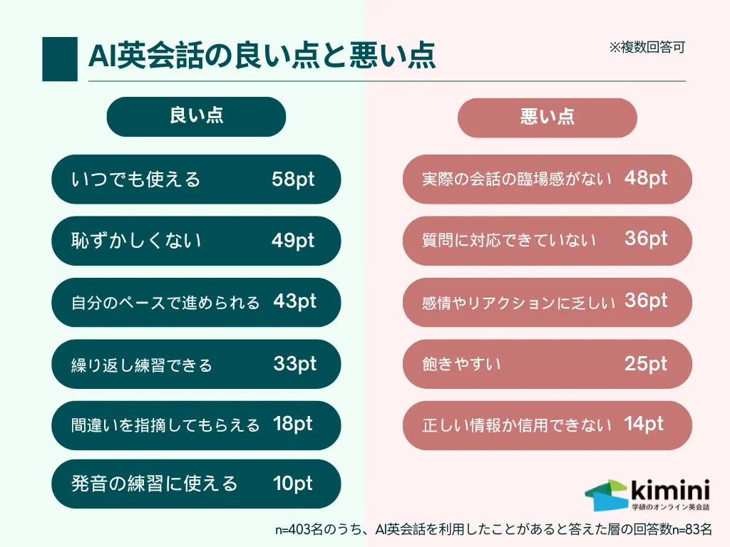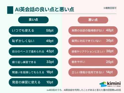 一方、「AI英会話で良いと感じている点」を尋ねたところ、「いつでも使える」(58pt)、「恥ずかしくない」(49pt)、「自分のペースで進められる」(43pt)といったポジティブな声も多く、利便性や気軽に受講できる環境が評価されていた。
