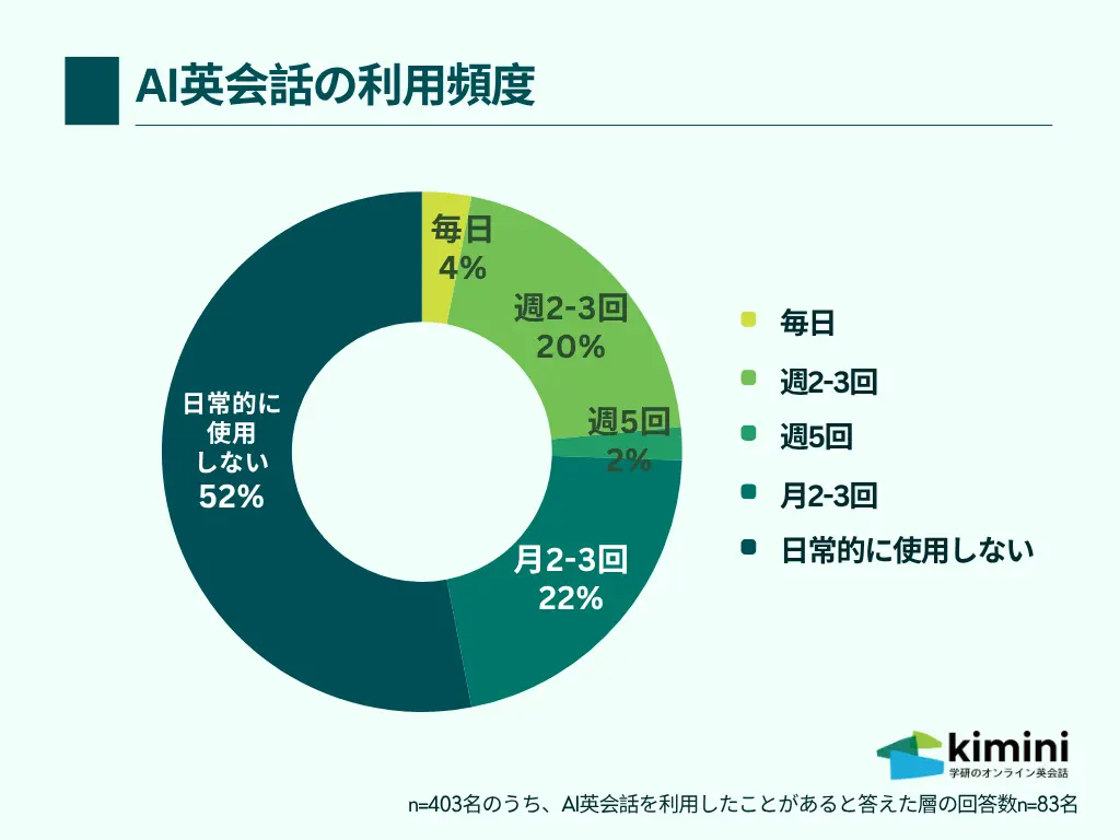 「AI英会話の使用頻度」を聞いたところ、「日常的に利用しない」といった回答が半数以上を占めた。また、「1回の使用時間」を尋ねたところ、「15分」が最も多く、短時間の利用が主流で、英語学習の「補助的な存在」として活用されている実態が見えた。