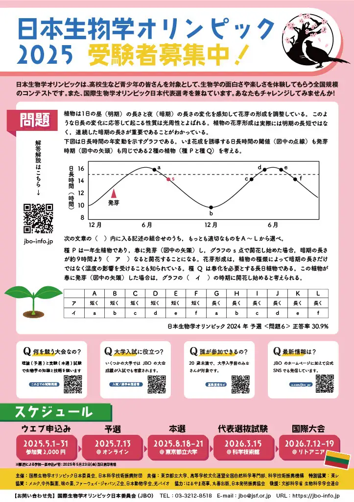日本科学技術振興財団は20日、青少年のための生物学コンテスト「日本生物学オリンピック2025」の参加申込を受付中だと発表した。