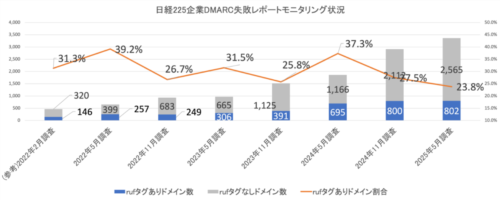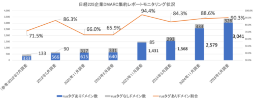 日経225企業は、208社(92.4%)が少なくとも1つのドメインでDMARCを導入していて、半年前の2024年11月(92.0%)からは0.4ポイントの増加で、ほぼ横ばい。