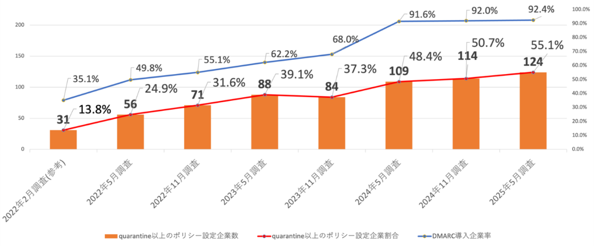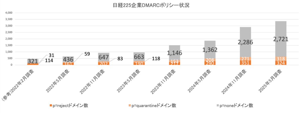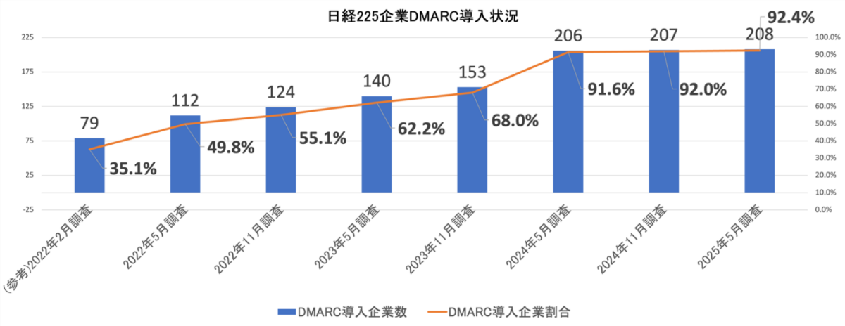 日経225企業は、208社(92.4%)が少なくとも1つのドメインでDMARCを導入していて、半年前の2024年11月(92.0%)からは0.4ポイントの増加で、ほぼ横ばい。