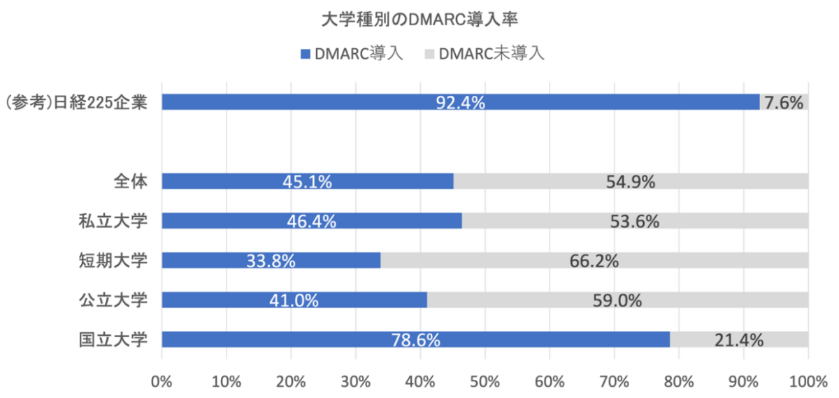 大学のDMARC導入率は45.1%で、昨年同月(38.4%)と比較すると6.7ポイント増加した。