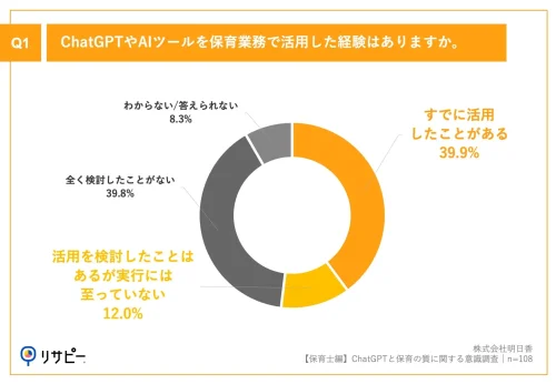 それによると、「ChatGPTやAIツールを保育業務で活用した経験はありますか」の問いには、「すでに活用したことがある」39.9%、「活用を検討したことはあるが実行には至っていない」12.0%の回答となった。