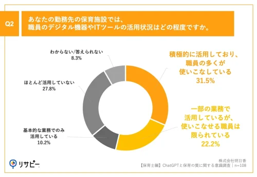 「あなたの勤務先の保育施設では、職員のデジタル機器やITツールの活用状況はどの程度ですか」の問いには、「積極的に活用しており、職員の多くが使いこなしている」が31.5%、「一部の業務で活用しているが、使いこなせる職員は限られている」が22.2%の回答だった。