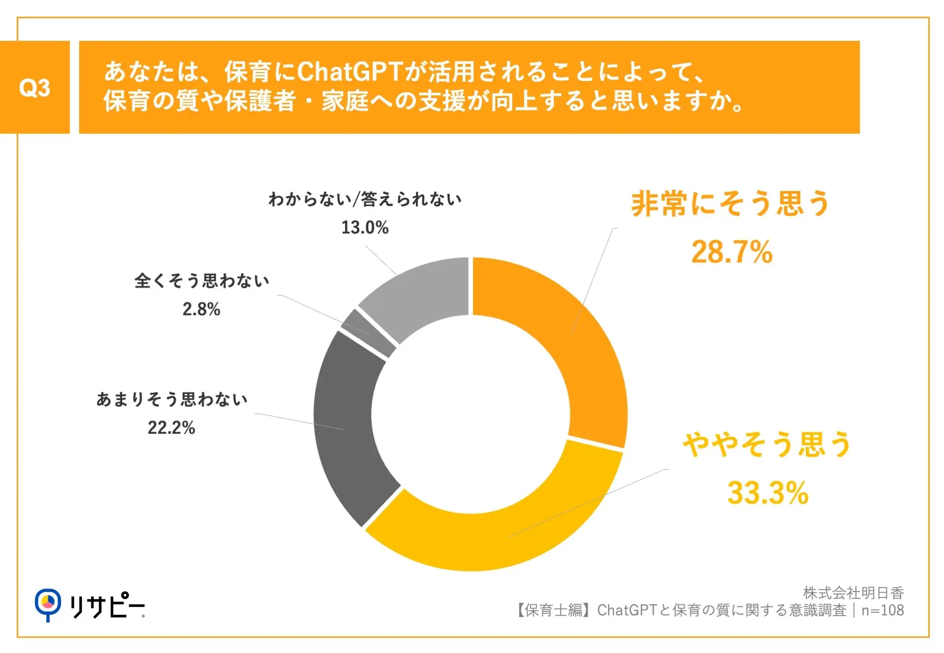 「あなたは、保育にChatGPTが活用されることによって、保育の質や保護者・家庭への支援が向上すると思いますか」の問いには、「非常にそう思う」が28.7%、「ややそう思う」が33.3%の回答だった。