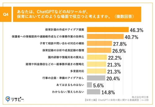 「あなたは、ChatGPTなどのAIツールが、保育においてどのような場面で役立つと考えますか」の問いでは、「保育計画の作成やアイデア提案」46.3%、「保護者への情報提供や連絡帳作成などの事務作業の効率化」40.7%、「子育て相談や問い合わせ対応(FAQ化など)の補助」27.8%の回答となった。