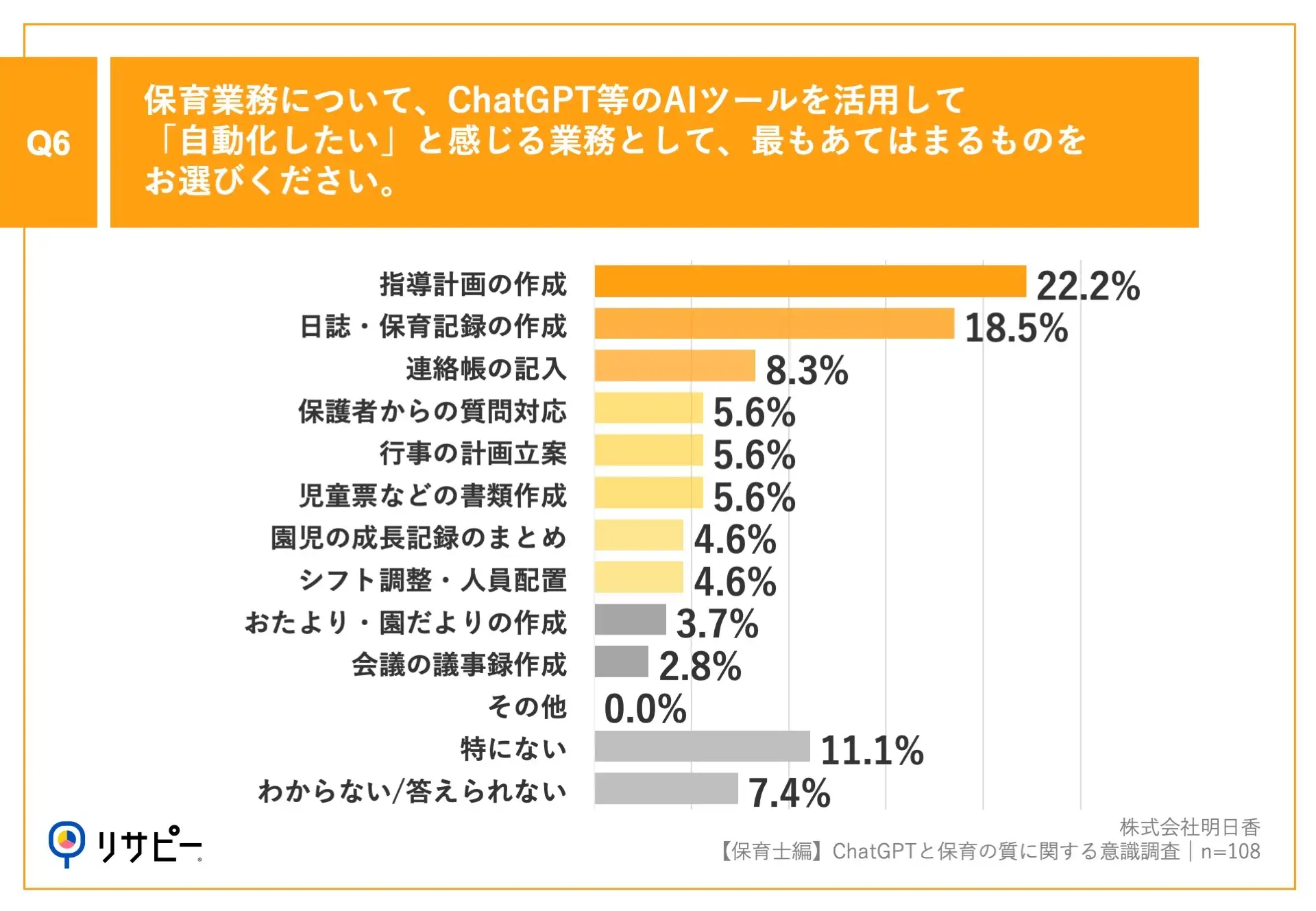 「保育業務について、ChatGPT等のAIツールを活用して『自動化したい』と感じる業務として、最もあてはまるものをお選びください」の問いには、「指導計画の作成」が22.2%、「日誌・保育記録の作成」が18.5%、「連絡帳の記入」が8.3%の回答となった。