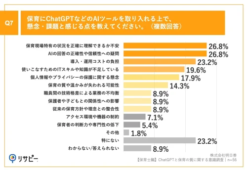 1つ目の問いで、「活用を検討したことはあるが実行には至っていない」「全く検討したことがない」と回答した人に、「保育にChatGPTなどのAIツールを取り入れる上で、懸念・課題と感じる点を教えてください」と質問したところ、「保育現場特有の状況を正確に理解できるか不安」が26.8%、「AIの回答の正確性や信頼性への疑問」が26.8%、「導入・運用コストの負担」が23.2%となった。