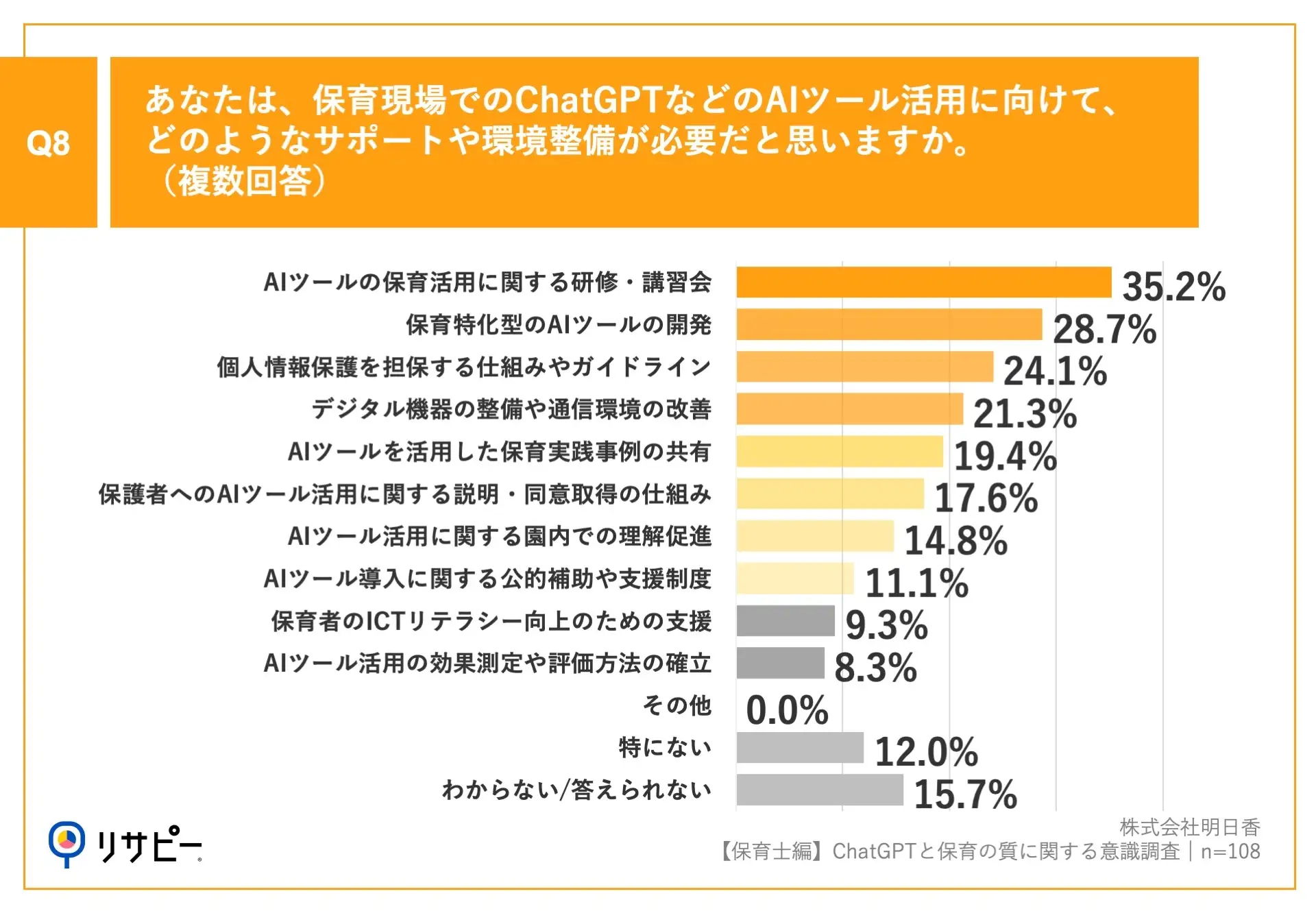 「あなたは、保育現場でのChatGPTなどのAIツール活用に向けて、どのようなサポートや環境整備が必要だと思いますか」の問いには、「AIツールの保育活用に関する研修・講習会」が35.2%、「保育特化型のAIツールの開発」が28.7%、「個人情報保護を担保する仕組みやガイドライン」が24.1%の回答となった。