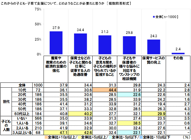 「これからの子ども・子育て支援について、どのようなことが必要だと思うか」については、「養育や教育のための経済的支援の強化」(37.9%)が最多。続いて、「保育士などの子どもと関わる仕事に従事する人の処遇改善」(34.4%)、「子どもの意見を聞き、子どもの権利が守られているか監視すること」(31.3%)、「子どもや保護者の様々な悩みに対応するワンストップの相談機関」(29.8%)、「保育サービスの質の向上」(24.3%)だった。