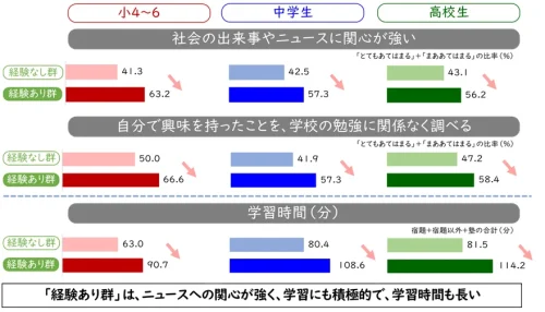 進路について深く考える経験があった子どもは、「勉強が好き」と答える比率が高く、「勉強しようという気持ちがわかない」の比率が低かった。また、「ニュースに関心が強い」「興味を持ったことを学校の勉強に関係なく調べる」比率が高く、学習時間が長いなど、学習に積極的だった。
