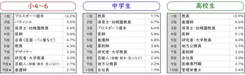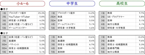 ちなみに、なりたい職業No.1は、小4~6では「プロスポーツ選手」、中学生では「プロスポーツ選手」と「教員」、高校生では「教員」だった。男女で異なり、小4~6の男子は「プロスポーツ選手」、女子は「店員(花屋・パン屋など)」が人気だった。また、中高生のなりたい職業No.1が「教員」であることはこの10年間で変化なかった。