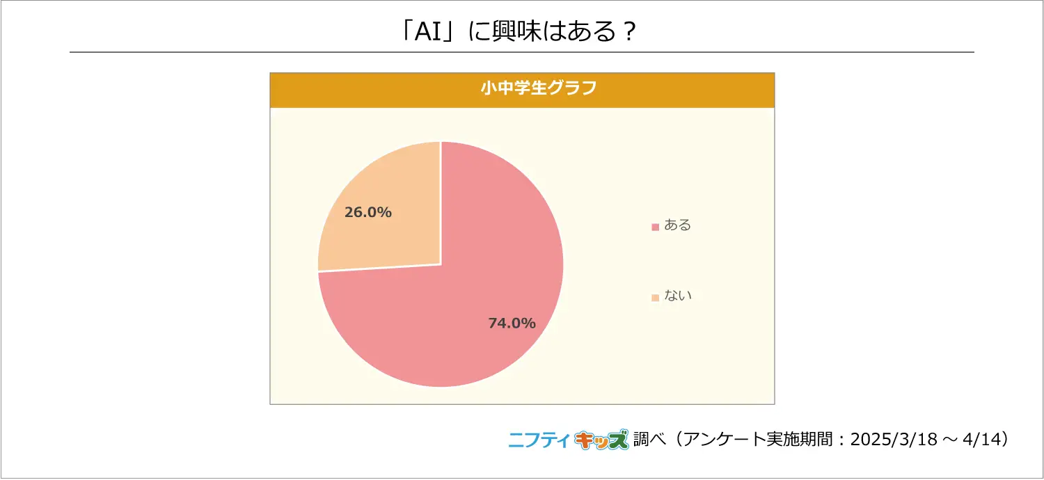 それによると、「AIに興味はあるか?」と尋ねたところ、74%の小中学生が「ある」と回答。「ない」は26%で、小中学生にもAIが身近なものになっていることが分かった。