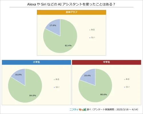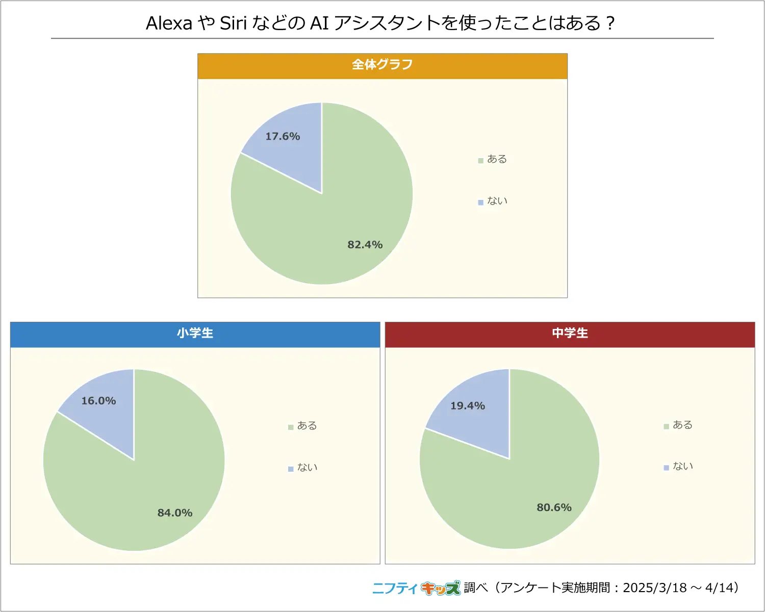 「Amazon AlexaやSiriなどのAIアシスタントを使ったことはあるか?」と尋ねたところ、小中学生ともに8割以上が「利用したことがある」と回答しており、AIアシスタントの普及率の高さが分かる。
