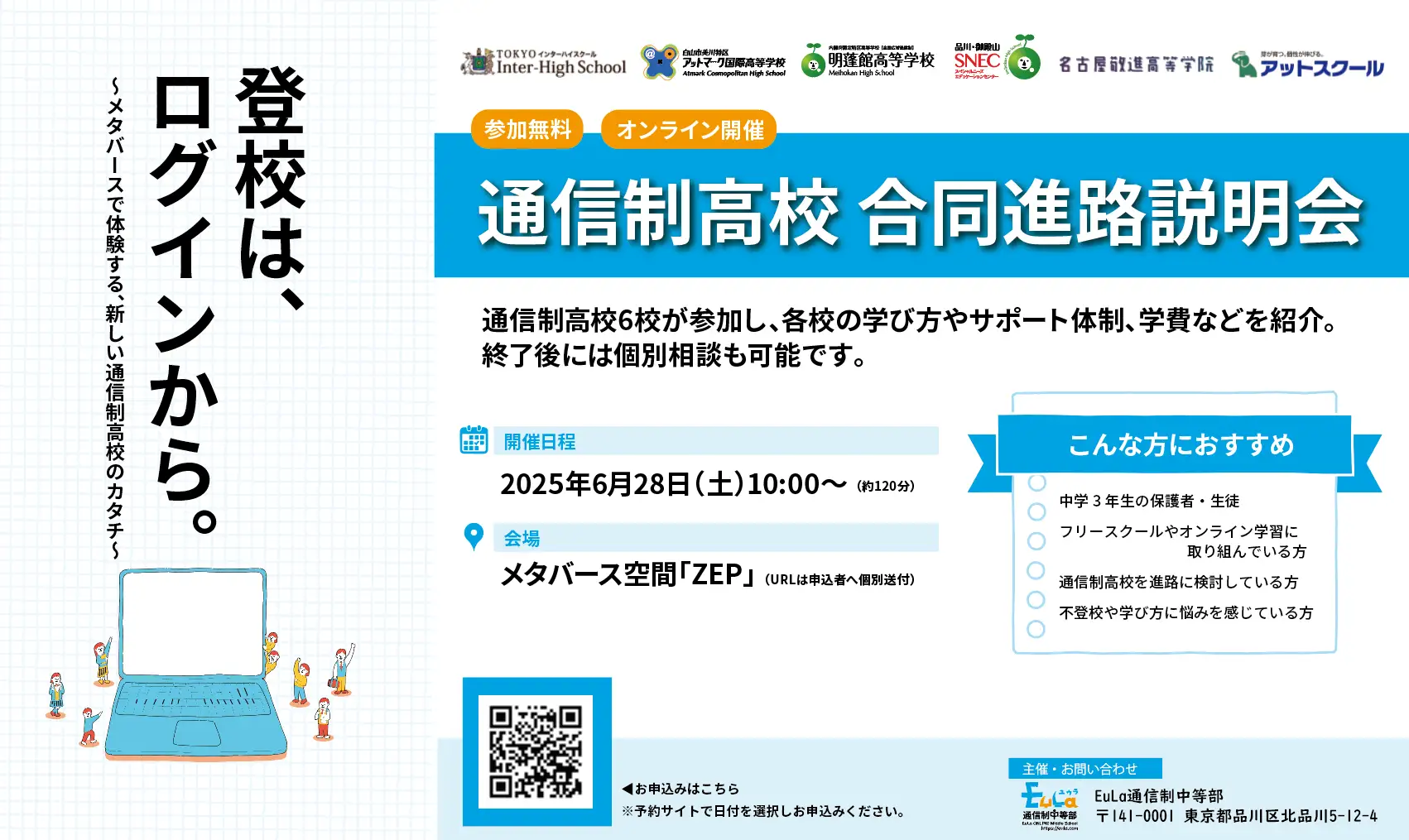 アットマーク・ラーニングは、同社が運営する EuLa(ユウラ)通信制中等部の主催で、ネットコースがある通信制高校6校と連携して、2Dメタバース空間(VRゴーグル不要)上で合同進路説明会を6月28日に無料開催する。