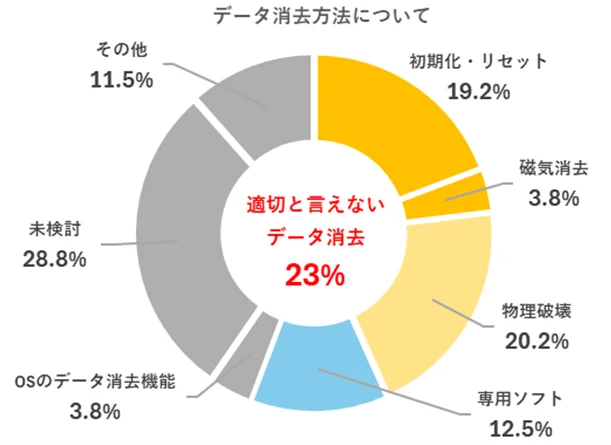 それによると、「データの消去方法」について聞いたところ、教育委員会の約4分の1(23%)が、GIGA端末に「適正と言えないデータ消去方法」(初期化・磁気消去)を行っていることが分かった。
