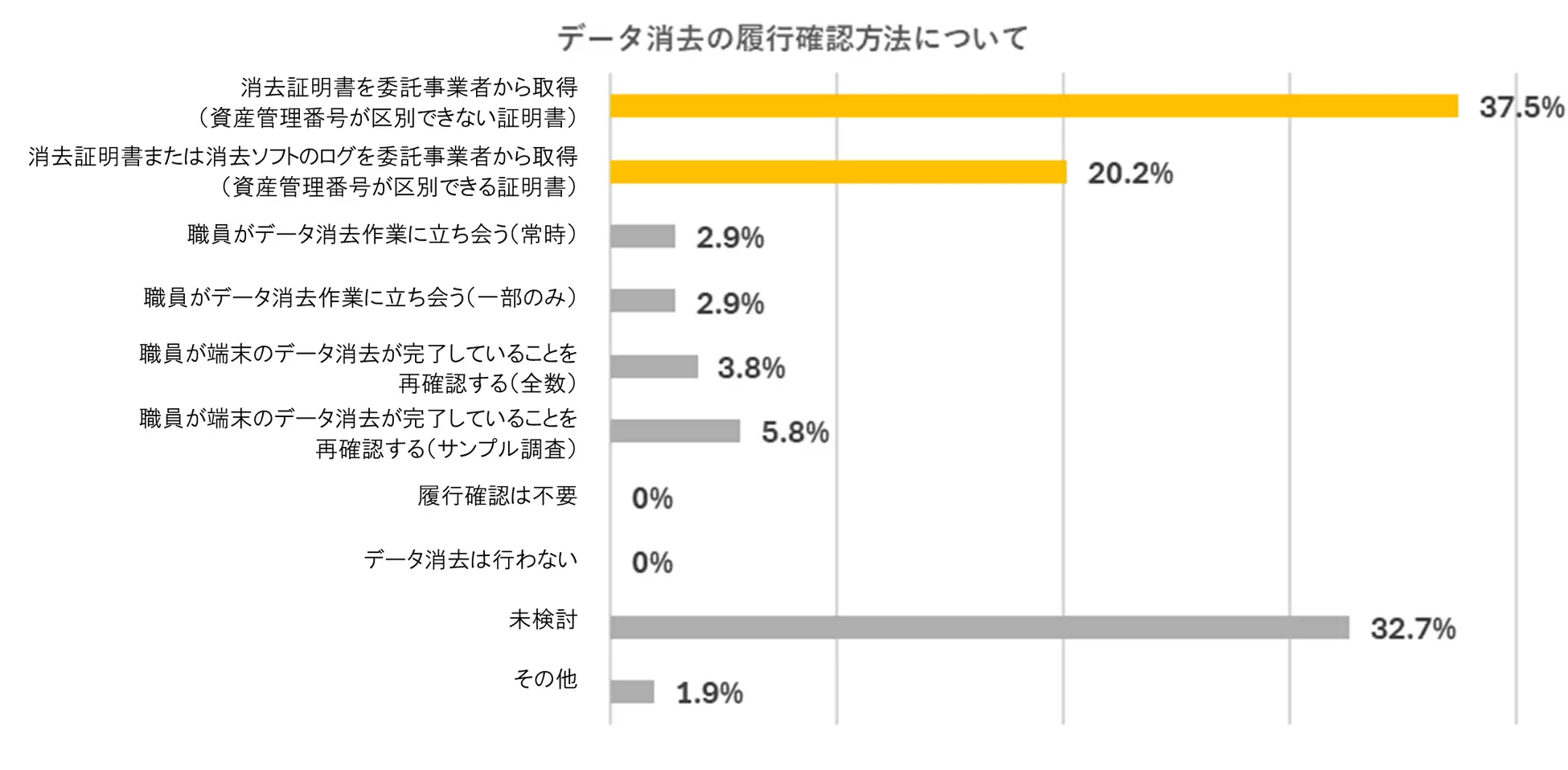 次に、「データ消去履行の確認方法」について聞いたところ、全国の教育委員会の3分の1以上(37.5%)が「1台ごとの消去ログが取れないデータ消去履行確認を実施」と回答。さらに、「資産管理番号を区別可能(=データ消去作業ログが取れる)な証明書を委託事業者から取得予定」は約2割(20.2%)で、大きな差が生まれている。