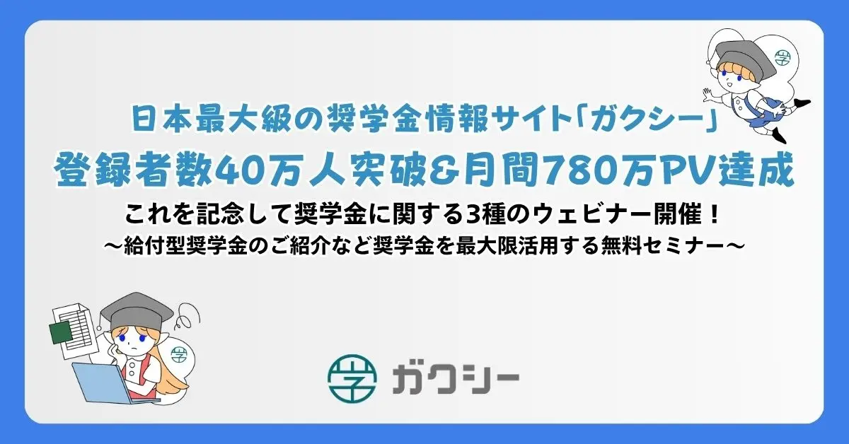 ガクシーは、奨学金情報サイト「ガクシー」の登録者数40万人突破、月間ページビュー数78万PV到達を記念し、奨学金や学生生活に役立つ情報を届ける3種の無料オンラインセミナーを開催する。