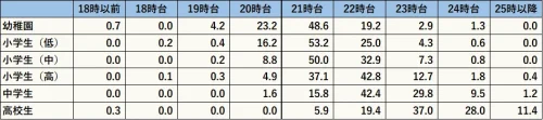 また、年齢が上がるにつれて就寝時刻が遅くなり、それに伴い睡眠時間も短くなり、幼稚園児と小学生低学年では21時台の就寝が最も多く(それぞれ53.0%、60.0%)、9時間以上の十分な睡眠時間を確保できていた。