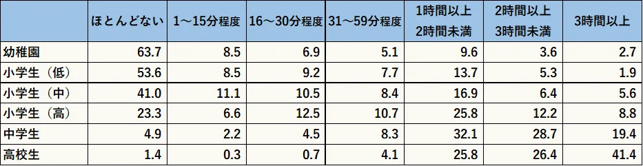 中学生になると大きな転換点を迎え、3時間以上の使用が19.4%、2時間以上が合計48.1%と急増。高校生では、3時間以上使用する割合が41.4%まで上昇し、スマホの長時間利用が一般化していることが分かった。