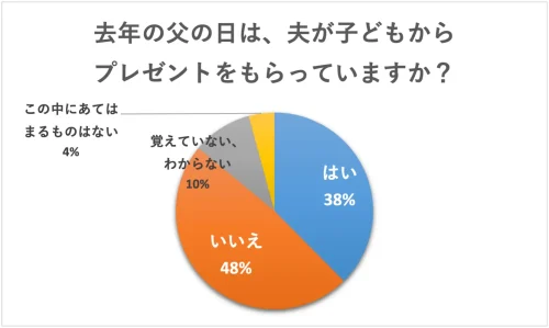 調査は子どものいる500世帯を対象に4月に行われた。それによると、去年の父の日に夫が子どもからプレゼントをもらった割合は38%で、プレゼントを受け取っていないと回答した割合が48%で最多となった。