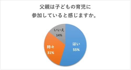 「父親が育児に関わっている」と感じている母親は過半数を超え、「時々関わっている」も含めると85.7%に上った。また、「父親が教育に参加している」と感じている母親は44%で、「時々」も合わせると8割近くに上った。
