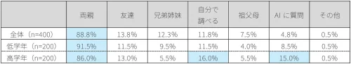 子どもが学校の勉強以外で疑問が生じた時に相談する相手は「両親」が最も多く、特に低学年では9割を超え、日常的な疑問に関しては親を頼りにしている一方で、高学年になると、「(本やインターネットを使って)自分で調べる」や「AIに質問する」といった選択肢も増加している。