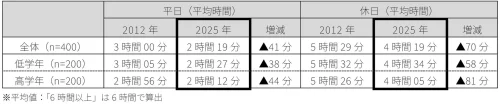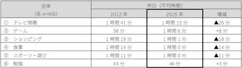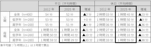 調査は小学生の子どもを持つ共働き夫婦400組を対象に、3月27日・28日に行われた。それによると、親子で一緒に過ごす時間は、平日2時間19分、休日4時間19分となり、同社が13年前の2012年実施した同様の調査と比べて、それぞれ41分と70分減少した。学年別に見ると、高学年の子どもとの休日の平均時間は4時間5分と、低学年の子どもよりも約30分短く、子どもの成長に伴う生活スタイルの変化か影響していると考えられる。