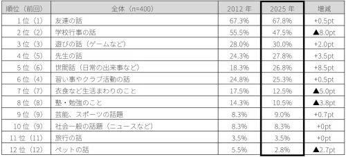 2012年と比べて親子の会話内容には大きな変化はなく、「友達の話」「学校行事の話」など人間関係や身近な出来事が引き続き会話の中心になっていることが分かった。また、6割以上の家庭で日常的に社会的なテーマが会話に登場。「物価高」「気候変動」「防災」など生活に身近なテーマに関心が寄せられていた。