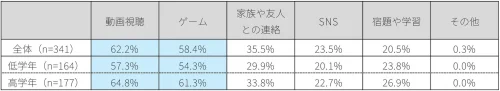 小学生の子どもの平日におけるスマートフォン・タブレットの平均利用時間はほぼ2時間に達しており、高学年ほど使用時間が増える傾向が見られた。スマートフォンやタブレットの利用目的で最も多かったのは「動画視聴」、次いで「ゲーム」となり、子どもたちの関心はエンタメ系コンテンツに集中していた。特に高学年では「動画視聴」「ゲーム」ともに低学年より高く、「家族や友人との連絡」や「SNS」といったコミュニケーション用途も、学年が上がるにつれて利用が広がっている。