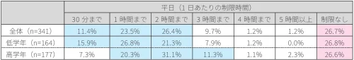 家庭でのスマートフォン・タブレット利用について時間制限を設けている家庭は全体の73.3%に上り、最も多かったのは「2時間まで」で、合計61.3%の家庭が「2時間以内」に設定していた。一方で、「制限なし」と回答した家庭も全体の26.7%を占めた。
