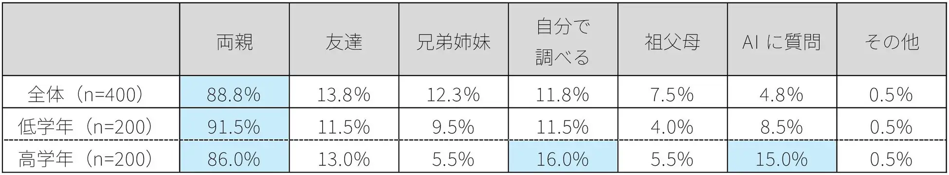 子どもが学校の勉強以外で疑問が生じた時に相談する相手は「両親」が最も多く、特に低学年では9割を超え、日常的な疑問に関しては親を頼りにしている一方で、高学年になると、「(本やインターネットを使って)自分で調べる」や「AIに質問する」といった選択肢も増加している。