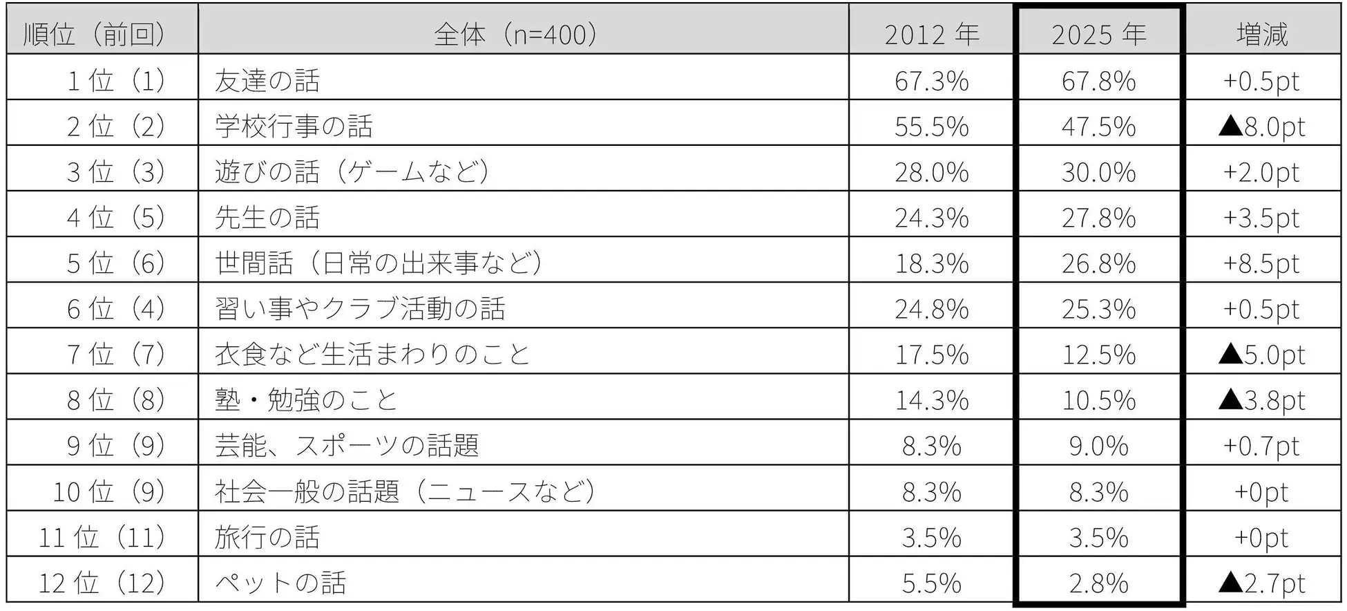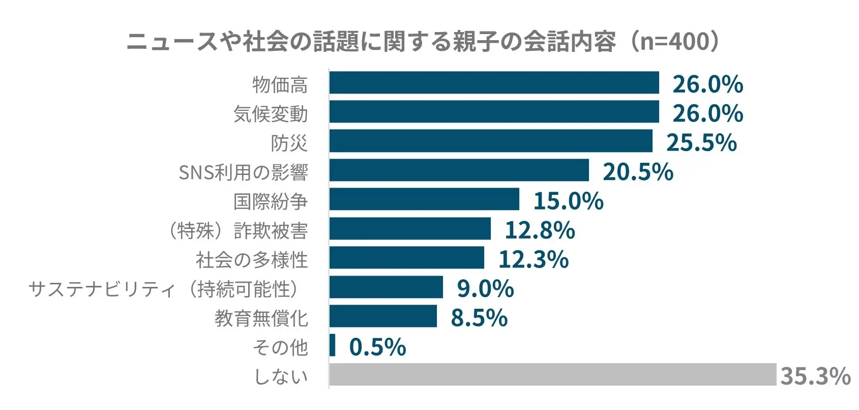 2012年と比べて親子の会話内容には大きな変化はなく、「友達の話」「学校行事の話」など人間関係や身近な出来事が引き続き会話の中心になっていることが分かった。また、6割以上の家庭で日常的に社会的なテーマが会話に登場。「物価高」「気候変動」「防災」など生活に身近なテーマに関心が寄せられていた。