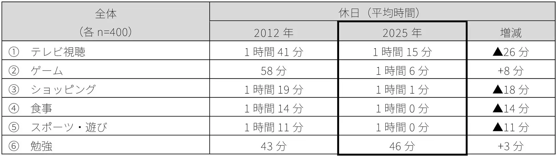 調査は小学生の子どもを持つ共働き夫婦400組を対象に、3月27日・28日に行われた。それによると、親子で一緒に過ごす時間は、平日2時間19分、休日4時間19分となり、同社が13年前の2012年実施した同様の調査と比べて、それぞれ41分と70分減少した。学年別に見ると、高学年の子どもとの休日の平均時間は4時間5分と、低学年の子どもよりも約30分短く、子どもの成長に伴う生活スタイルの変化か影響していると考えられる。