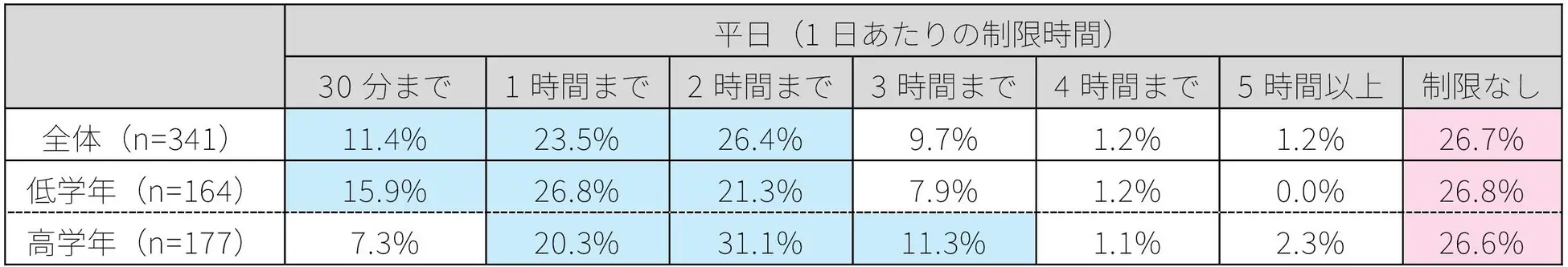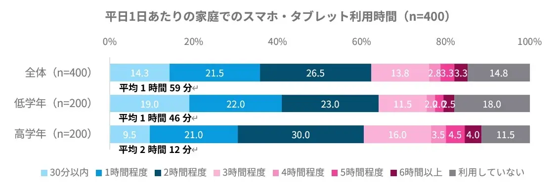 家庭でのスマートフォン・タブレット利用について時間制限を設けている家庭は全体の73.3%に上り、最も多かったのは「2時間まで」で、合計61.3%の家庭が「2時間以内」に設定していた。一方で、「制限なし」と回答した家庭も全体の26.7%を占めた。