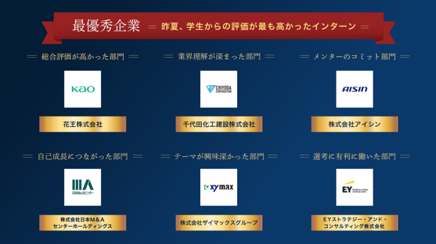 同調査は2017年から開始し、就活会議の会員が投稿したインターンシップに関する口コミ・評価をもとに、総合部門のほか「メンターのコミット」「テーマが興味深かった」などを含む6部門で学生からの評価の高いインターンシップを選定している。