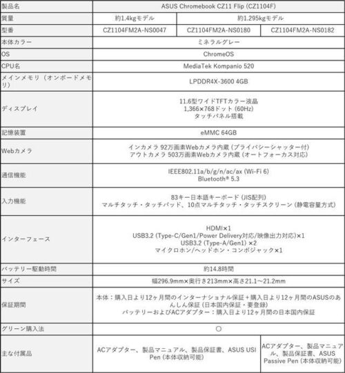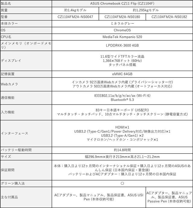 「ASUS Chromebook CZ11 Flip (CZ1104F) 」製品情報