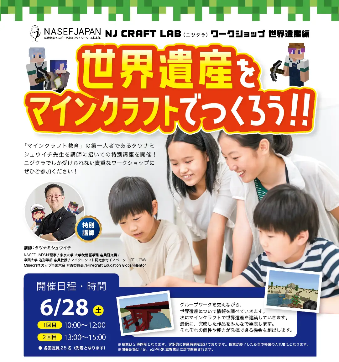 REDEE(レディー)は、滋賀県東近江市のe2PARK滋賀東近江店にてNASEF JAPANニジクラワークショップ「世界遺産をマインクラフトでつくろう!!」を6月28日に開催する。