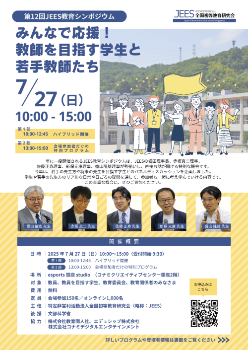 全国初等教育研究会(JEES)は、第12回JEES教育シンポジウム「みんなで応援!教師を目指す学生と若手教師たち」7月27に開催する。
