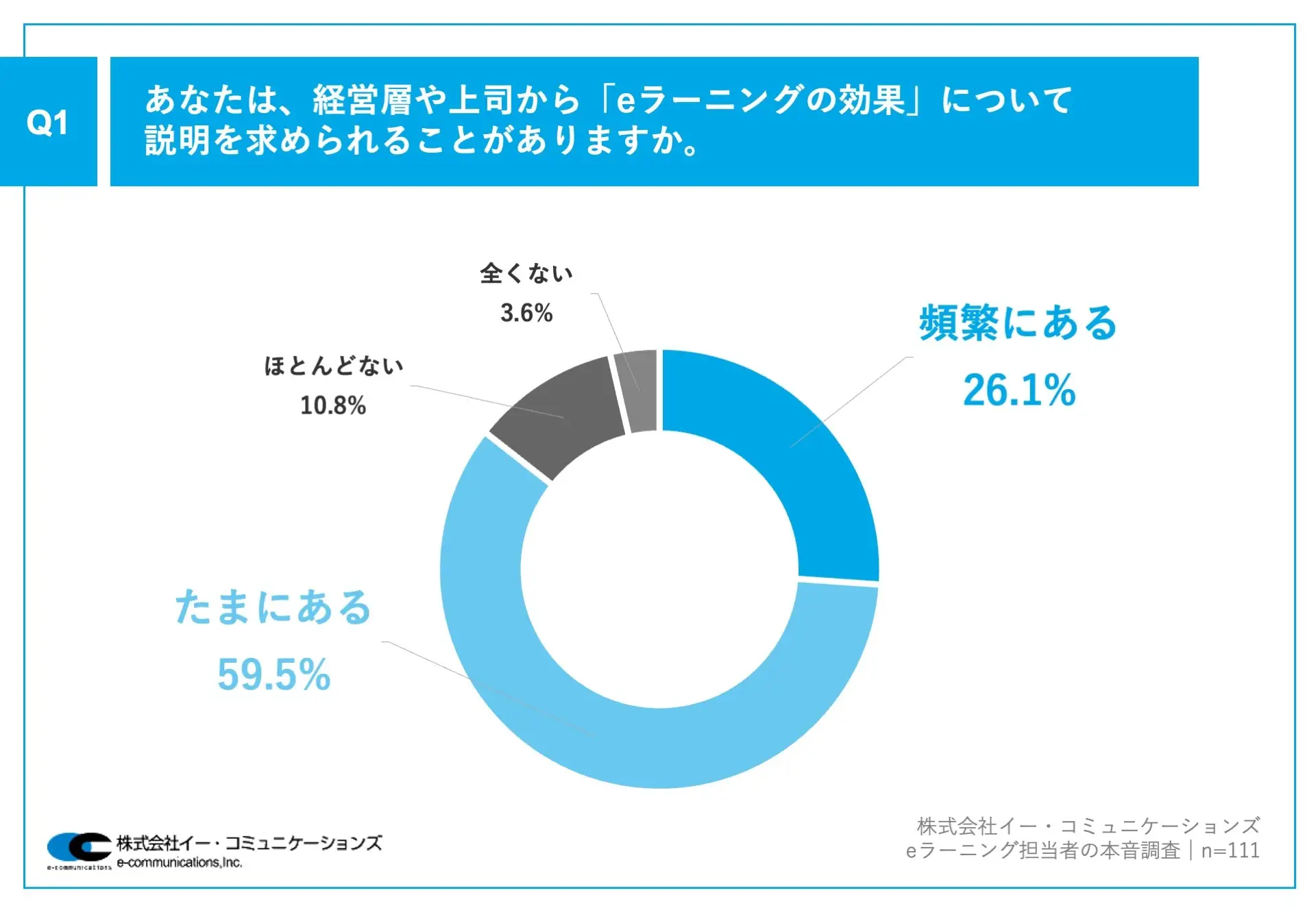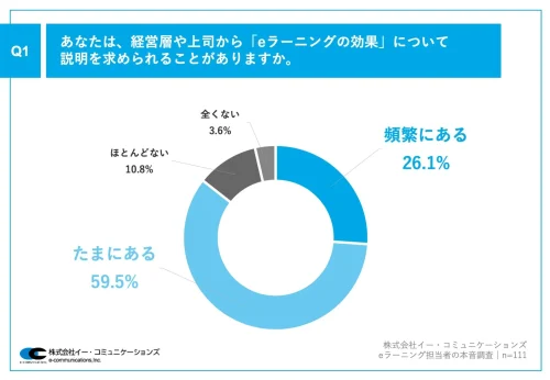 それによると、「経営層や上司から『eラーニングの効果』について説明を求められることがあるか」と質問したところ、「頻繁にある」が26.1%、「たまにある」が59.5%という回答だった。「ほとんどない」は10.8%、「全くない」は3.6%。