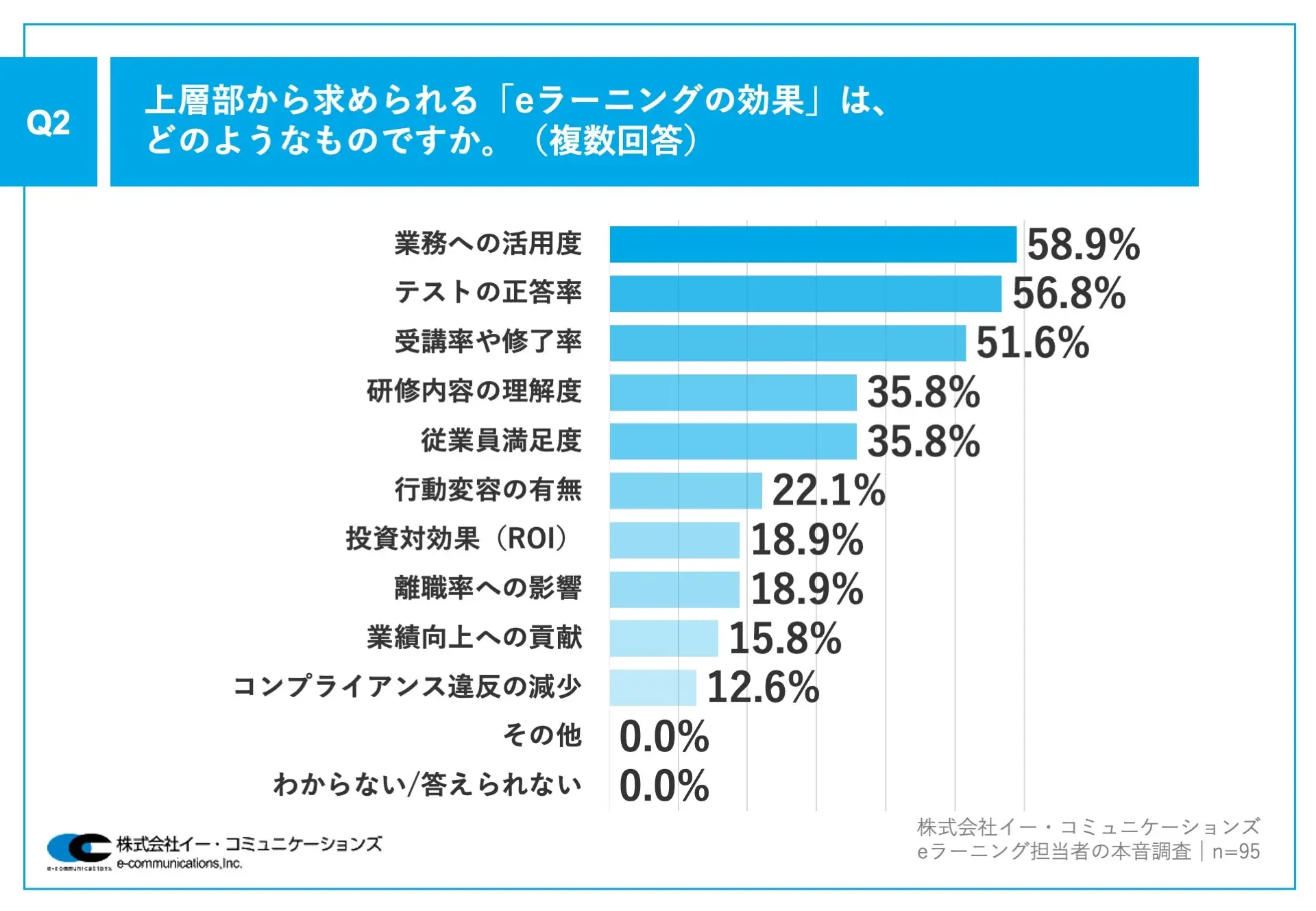 「上層部から求められる『eラーニングの効果』」について聞いたところ、「業務への活用度」が58.9%、「テストの正答率」が56.8%、「受講率や修了率」が51.6%だった。以下、