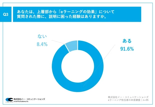 また、「上層部から『eラーニングの効果』について質問された際に、説明に困った経験はあるか」と質問したところ、「ある」が91.6%で圧倒的に多く、「ない」は8.4%だった。