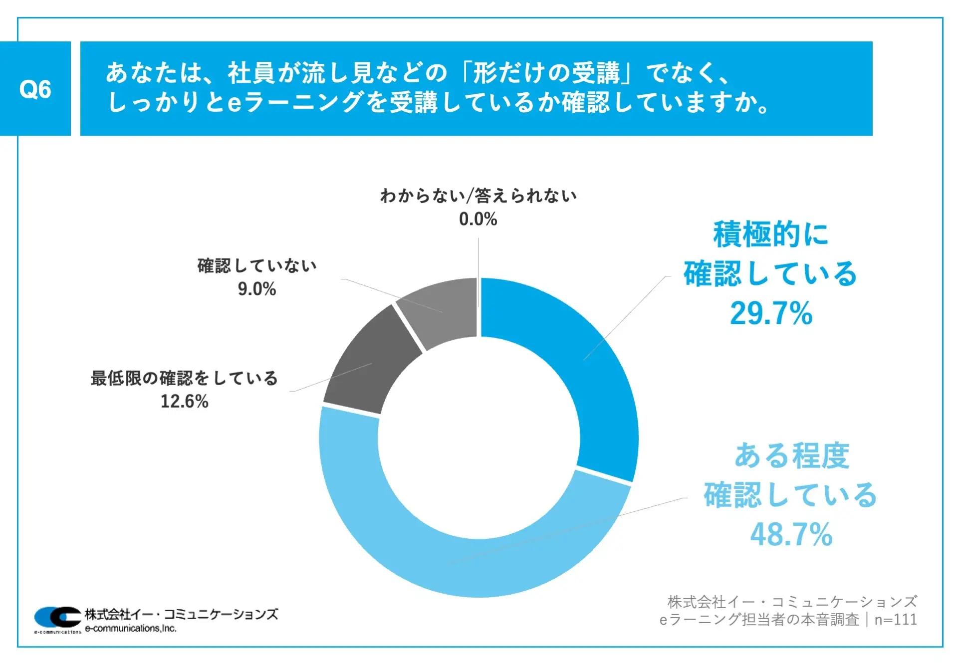 「社員が流し見などの『形だけの受講』ではなく、しっかりとeラーニングを受講しているか確認しているか」と質問したところ、「積極的に確認している」が29.7%、「ある程度確認している」が48.7%、「最低限の確認をしている」が12.6%という回答だった。