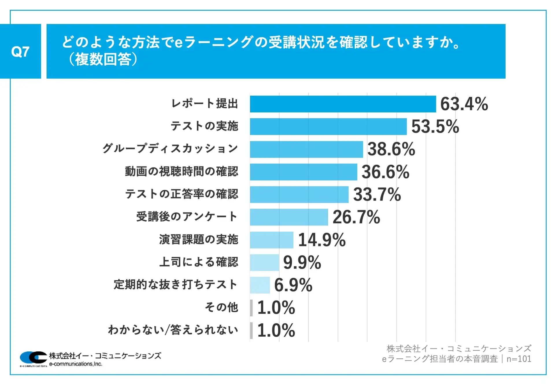 では、「どのような方法でeラーニングの受講状況を確認しているのか」を尋ねたところ、「レポート提出」63.4%、「テストの実施」53.5%、「グループディスカッション」38.6%、
