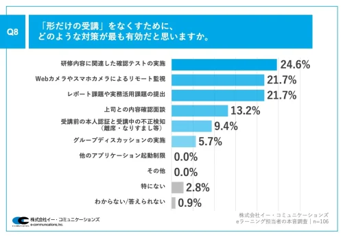 また、「『形だけの受講』をなくすために、どのような対策が最も有効だと思うか」と質問したところ、「研修内容に関連した確認テストの実施」が24.6%、「Webカメラやスマホカメラによるリモート監視」が21.7%、「レポート課題や実務活用課題の提出」が21.7%という回答になった。